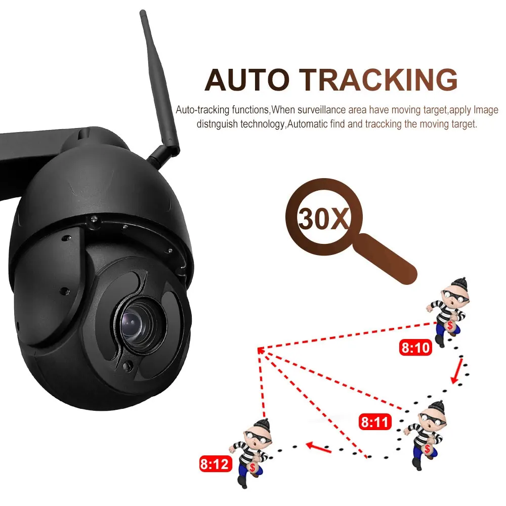 Product Name: في الهواء الطلق PTZ اللاسلكية CCTV 5MP 4G واي فاي كامل HD 30X AI تتبع السيارات كاميرا الأمن عمل كشف مقاوم للماء التحكم في الأجهزة